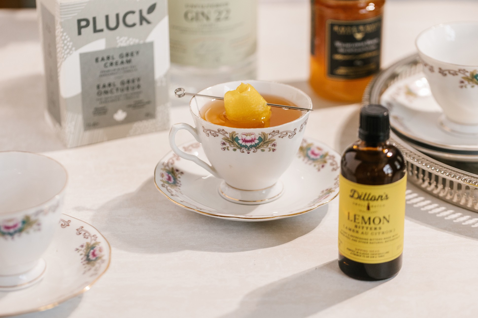 4.Strain your cocktail into a vintage teacup and garnish with lemon.