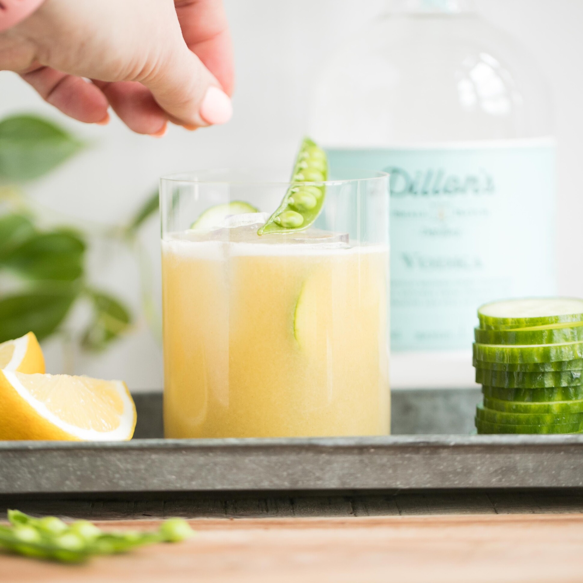 4. Garnish with fresh cucumber slice or spring pea pod.